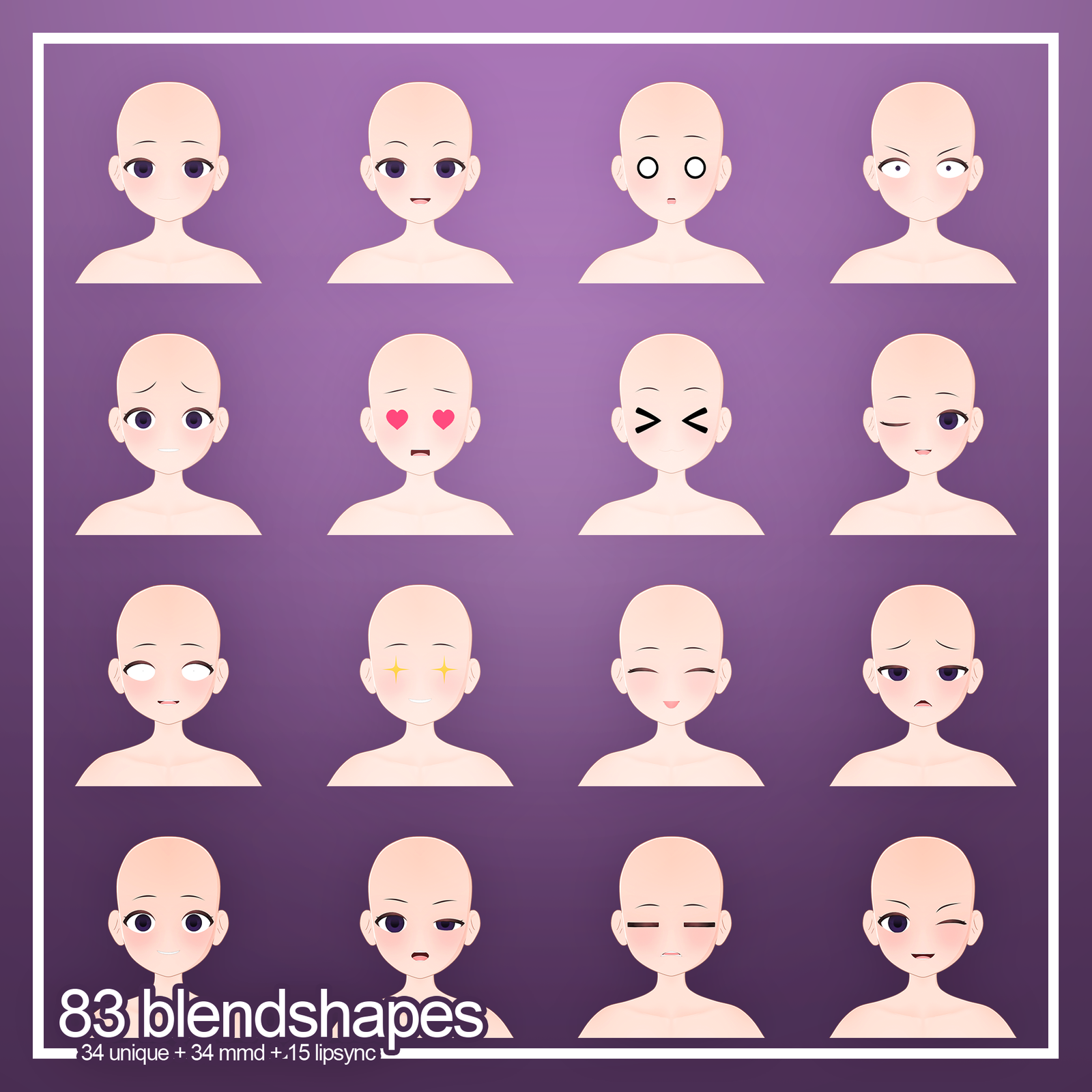 - 83 Blendshapes (34 Unique + 34 MMD Compatible + 15 Visemes)