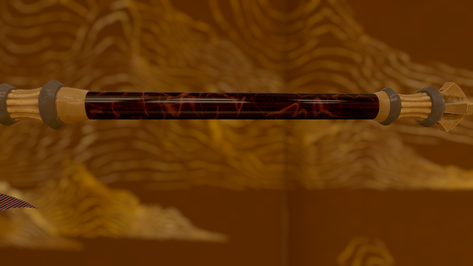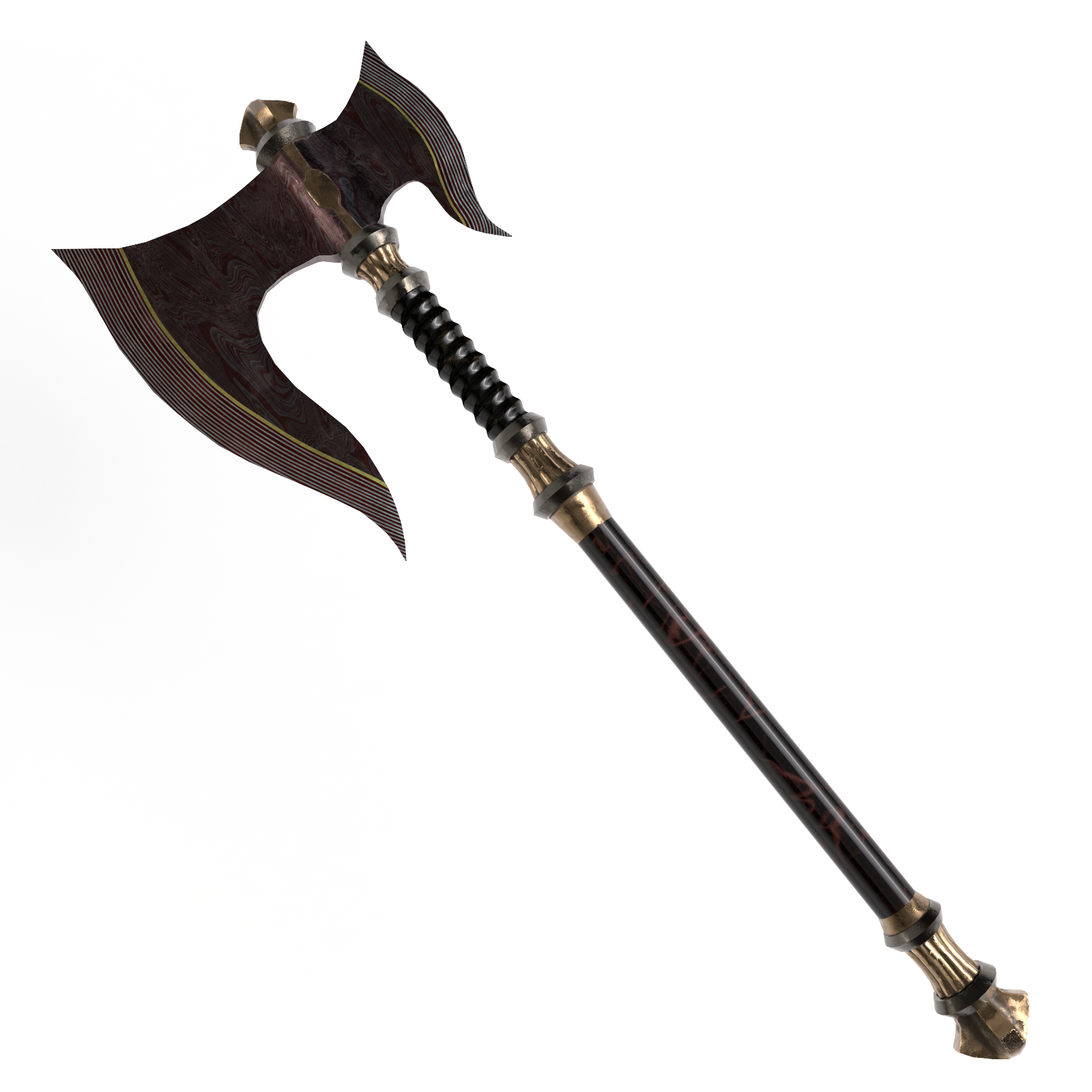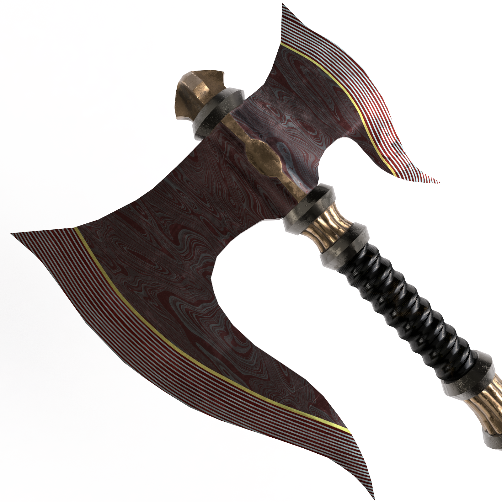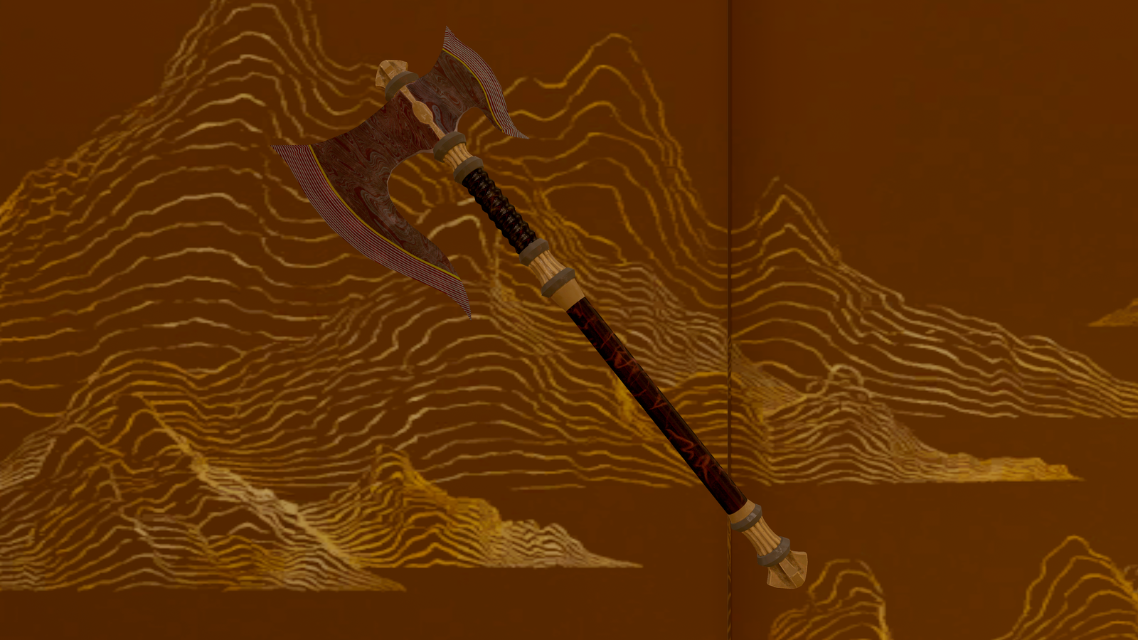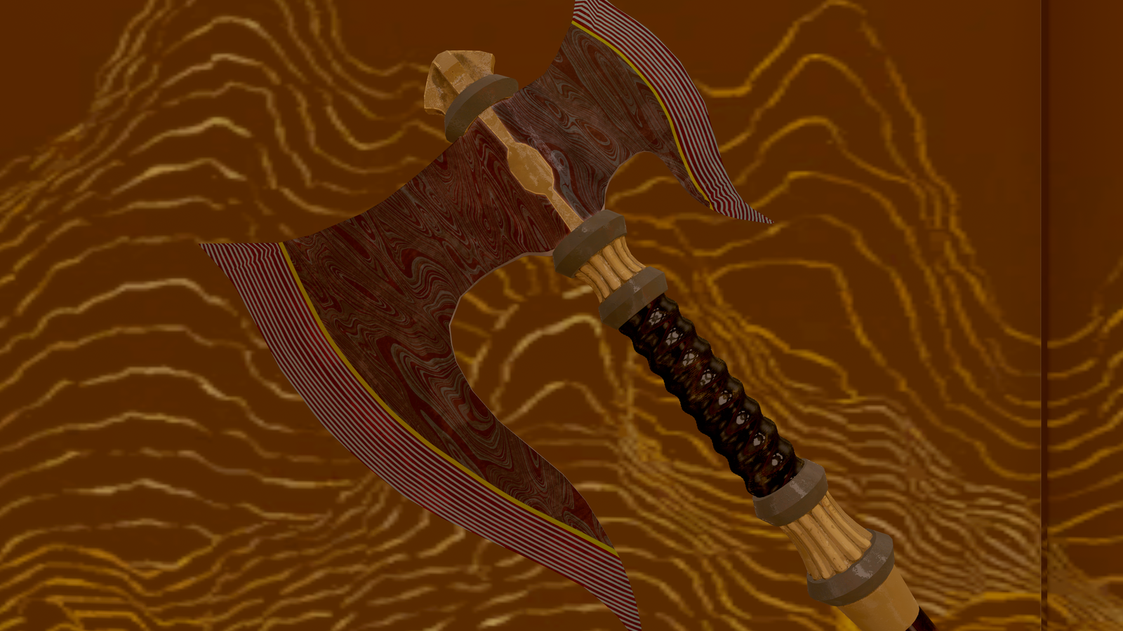 A fancy axe made from a damascus steel stained red.