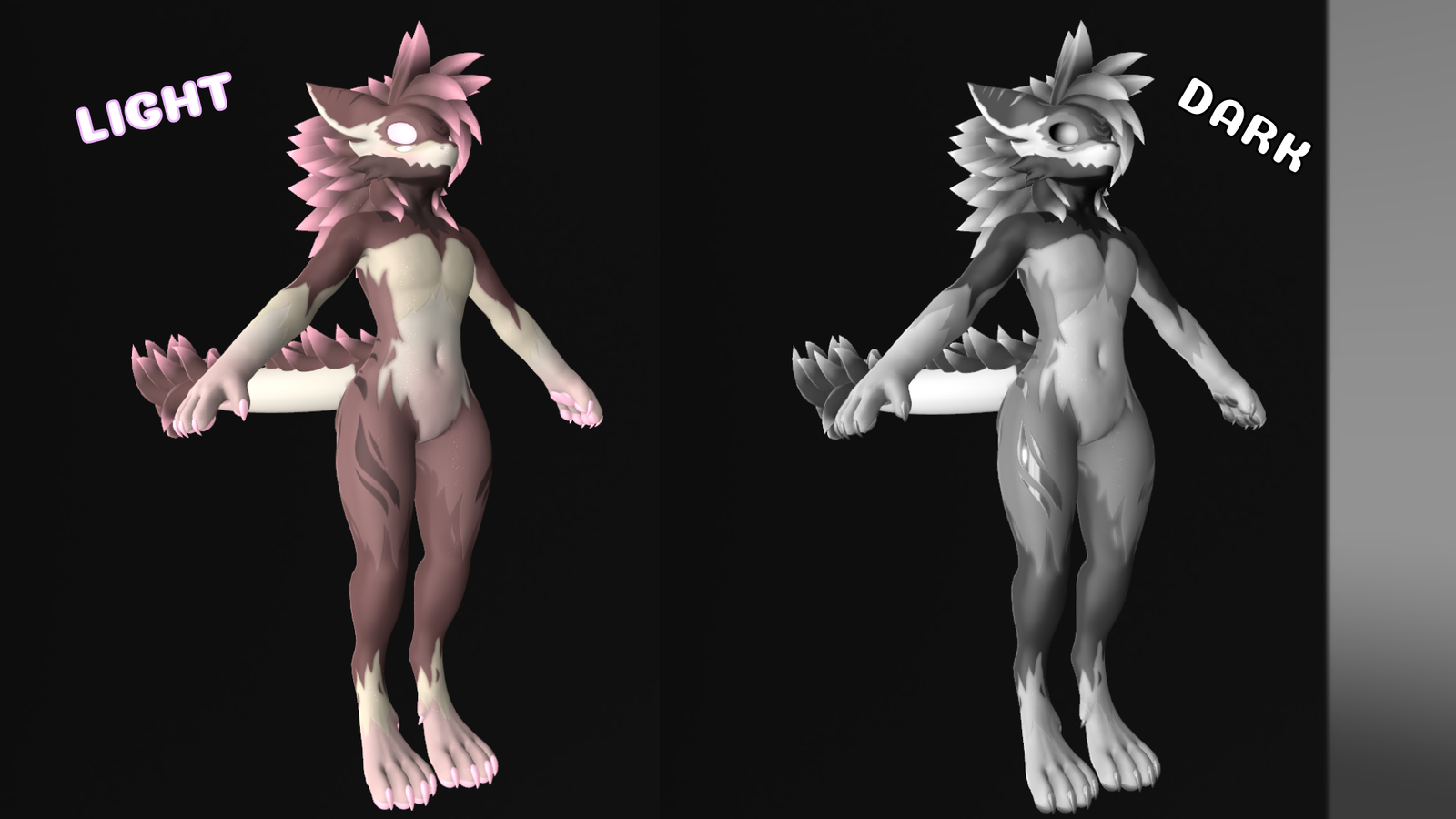 Includes: 4K textures with 2 variations (light and dark), premade Poiyomi materials (All materials work with hue sliders built into the model)
