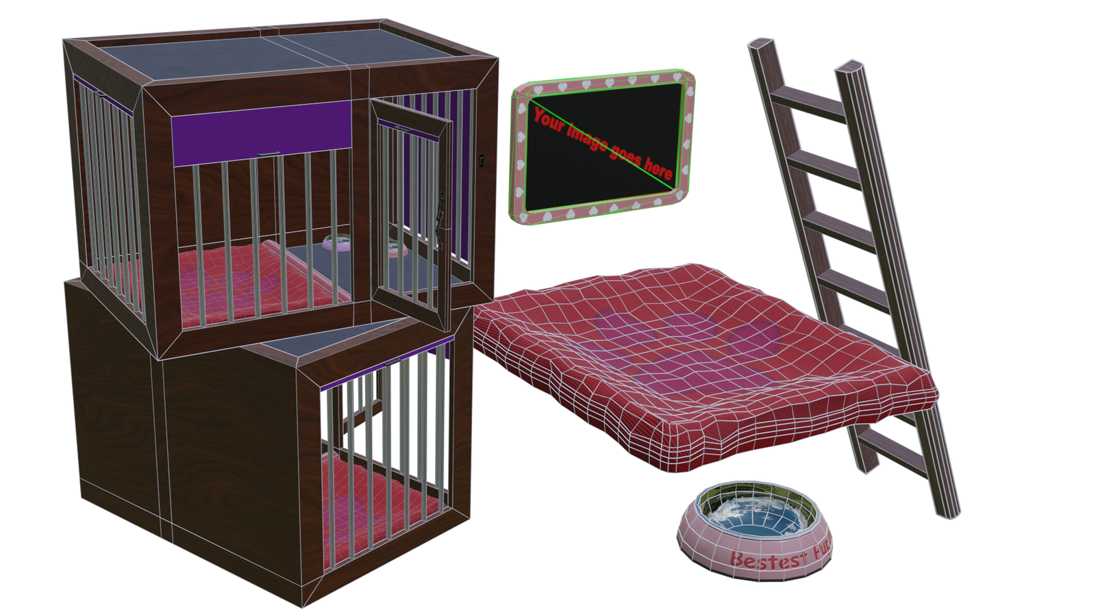 - Puppy house itself: 7300 tri, 3 materials (Main house + bars, curtains+ pillow, bowls + hinges + latch)