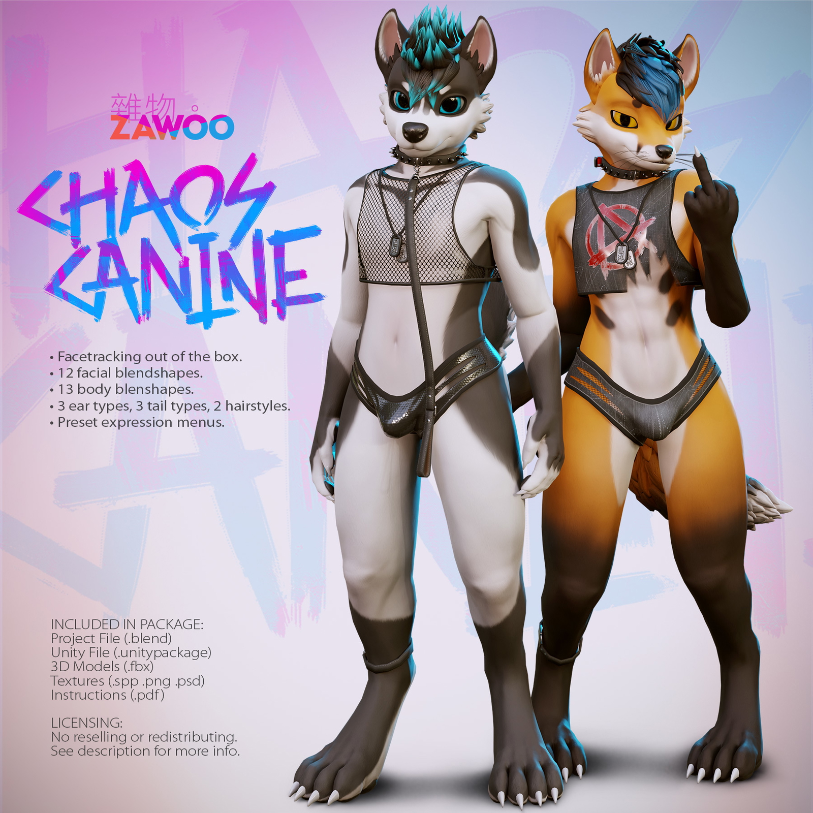 Do you know that 50% of furries have some kind of canine fursona? You might be basic, but you can be -your- unique type of basic! Chaos Canine features 12 facial blendshapes, 14 body blendshapes, 3 ear options (normal, fold, and big), and 3 tail options (fluffy, curled, and plump). You can adapt Chaos to look just like your sona! Wolf, dog, fox, fennec, hyena…. (which are not canines, but close enough) Do whatever you want! The world is your oyster (which are also not canines).