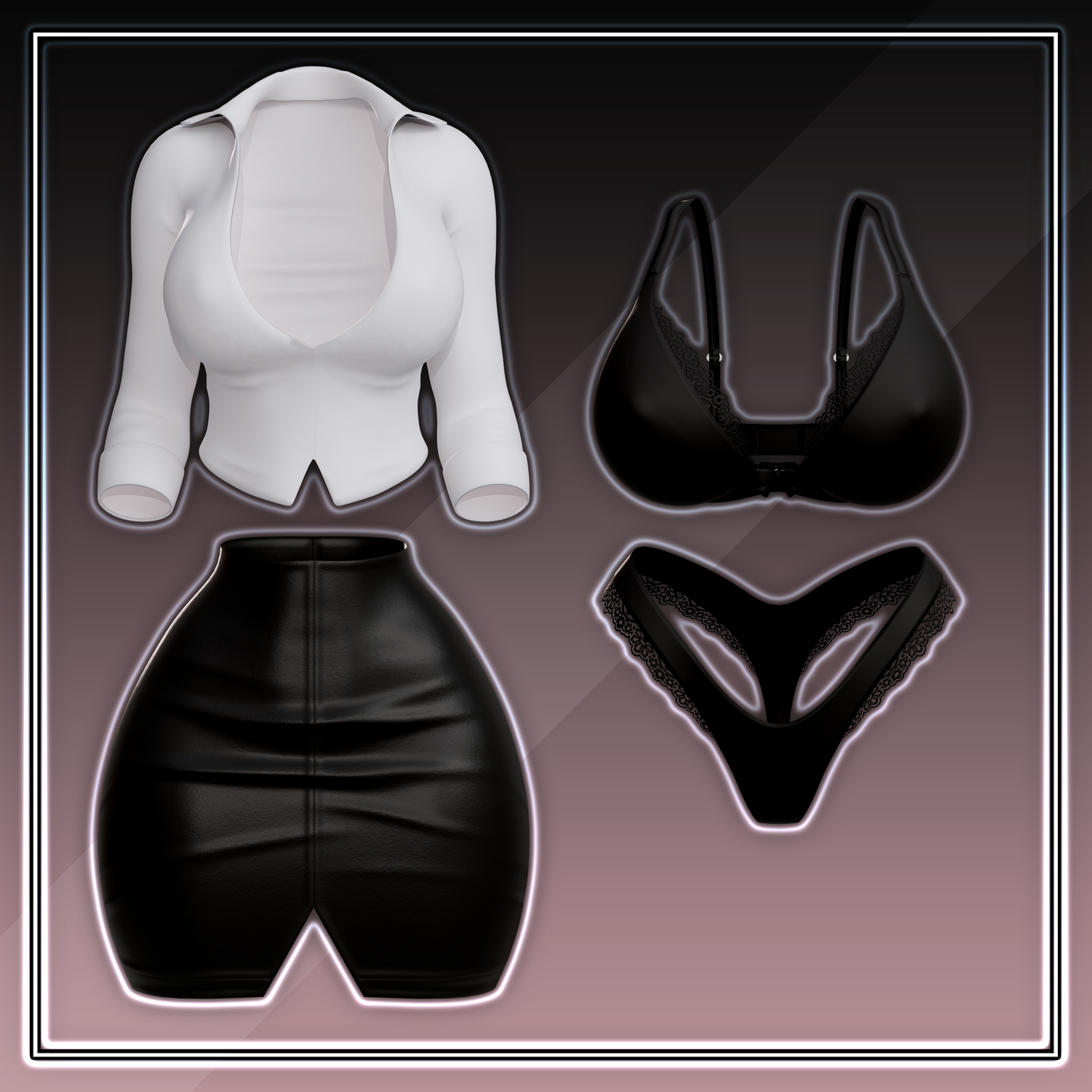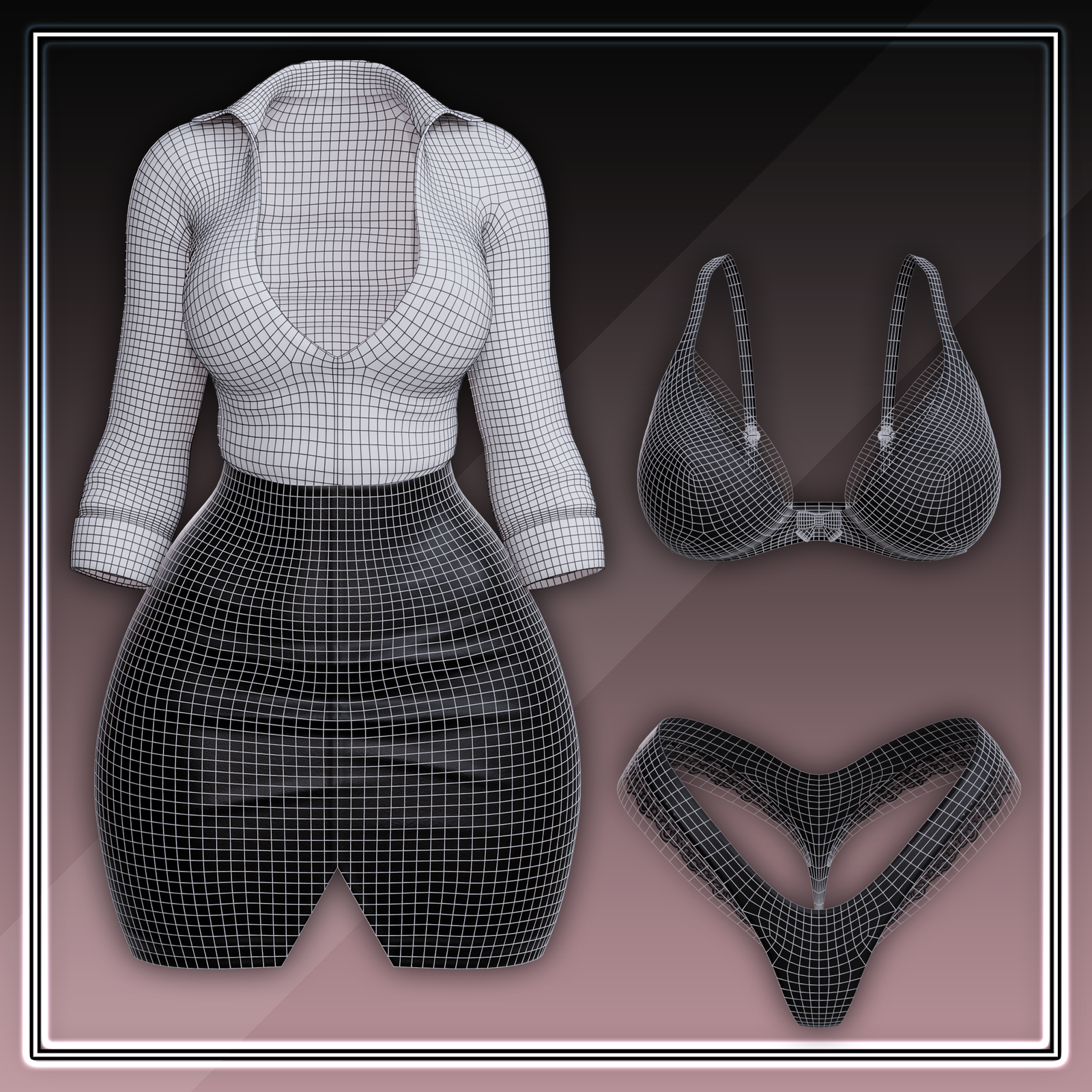 - Includes Lingerie, Blouse, and Skirt