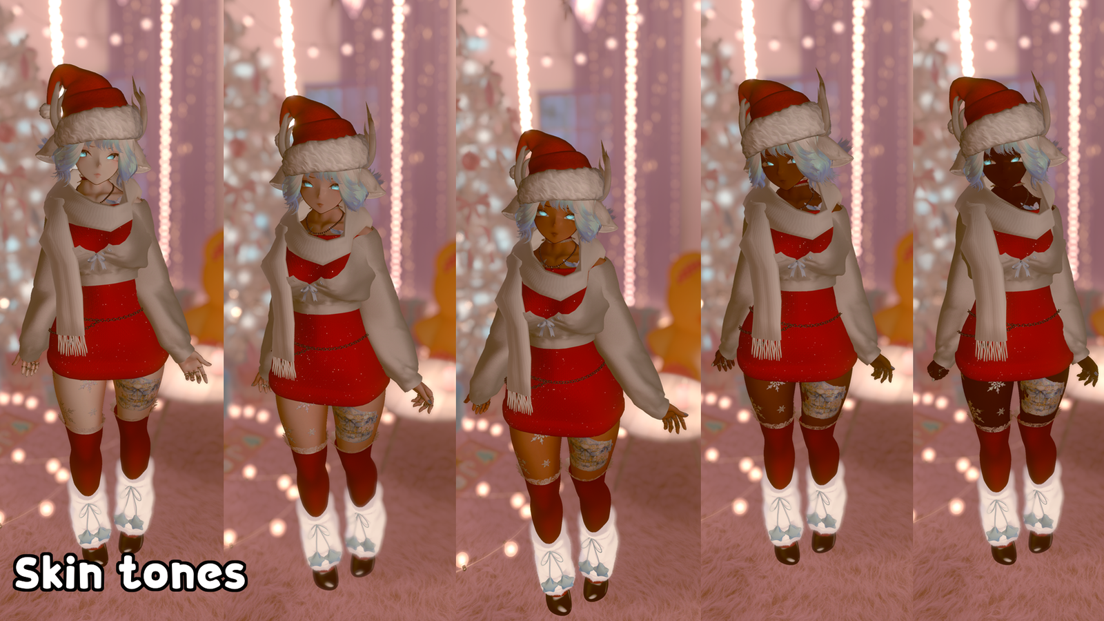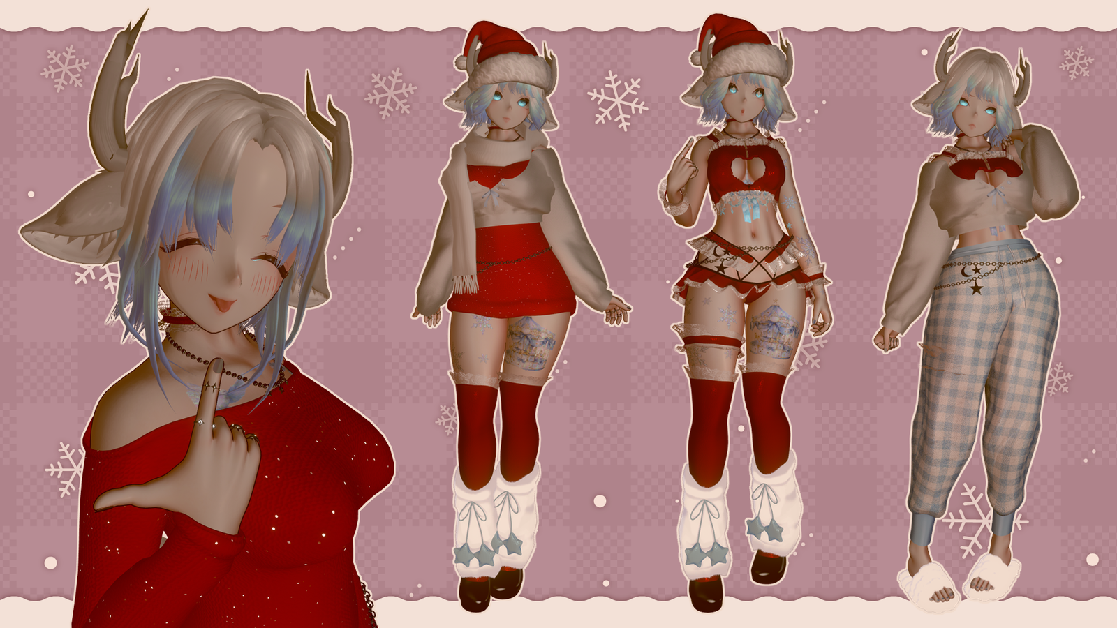 Base (my edit, do not use) | Head (my edit, do not use) | Hair 1 | Hair 2 | Hair 3 | Hair 4 | Cardigan | Sweater and underwear | Christmas outfit | Pants | Pasties | Hat | Scarf | Heels | Slippers | Earrings | Necklace | Chain | Rings | Leg warmers | Deer set | Puppy ears | Puppy tail | Bear ears | Bear tail | Hair textures | Skin textures | Eye texture | Tattoos | GoGo Loco | Bows | SPS | Av3Creator | Contacts | Menu icons | Advanced gestures | Limb scaling