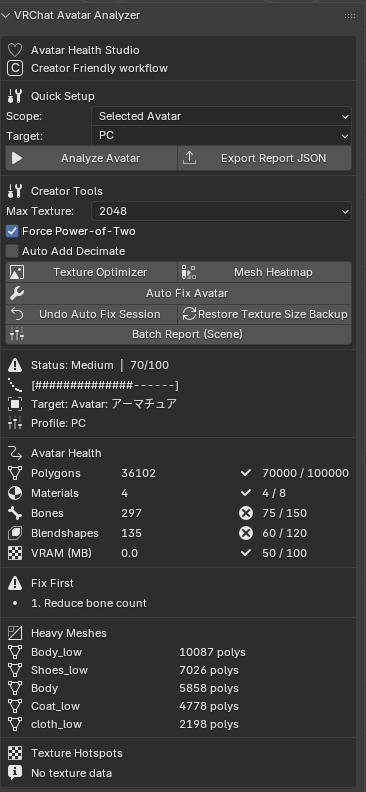 VRChat Avatar Analyzer is a creator-first Blender add-on that helps you diagnose, optimize, and ship avatars faster with confidence.