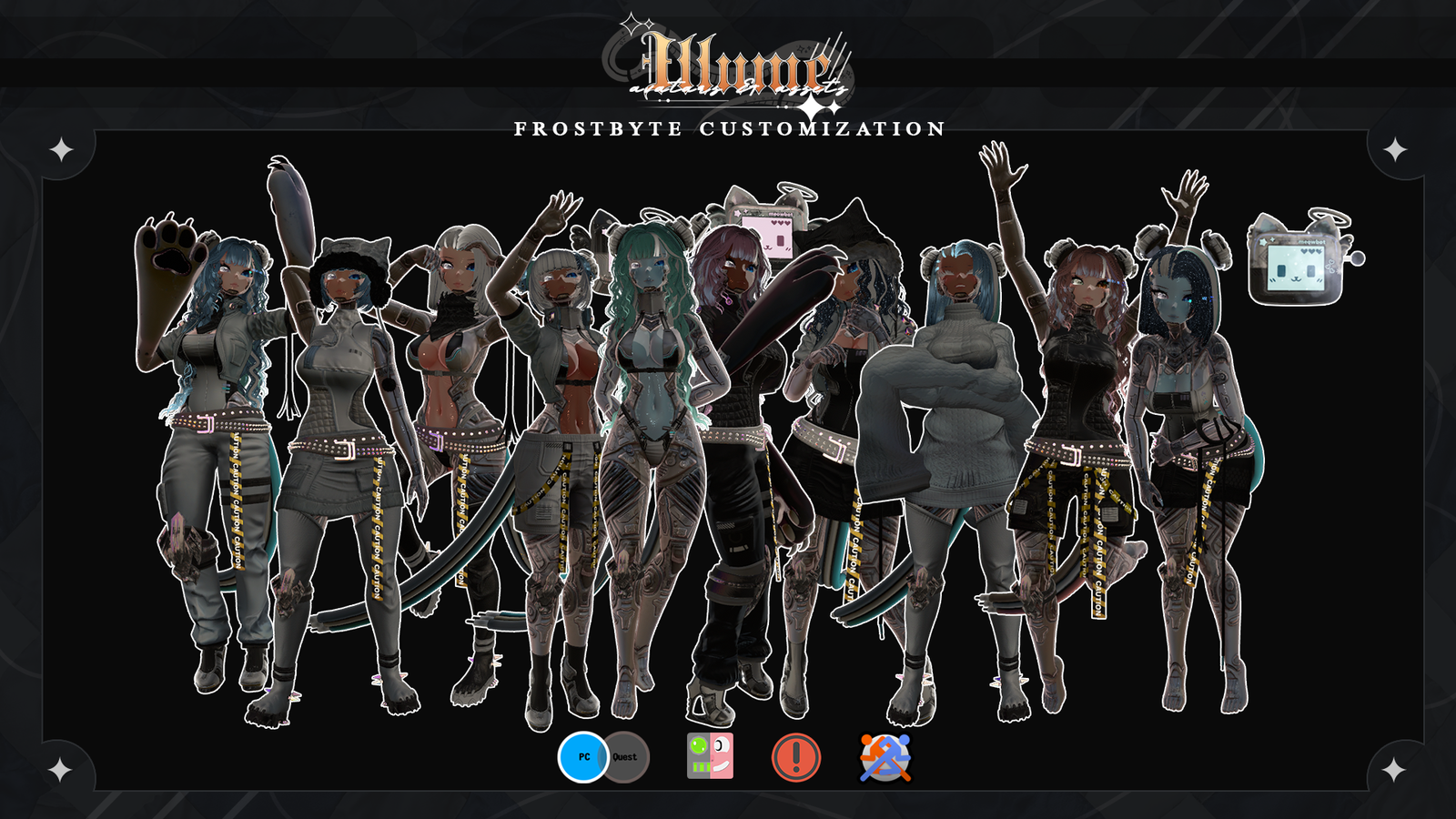 ribbons: funsizedata ( https://funsizedata.gumroad.com/l/RIBBON ) everything else: other hairs, body/face textures, arm wires, belts, bodysuit, boots, bra, mech buns, hat, heels, jacket, kneepad, pants, scarf, shorts, skirt, sweater, tail, top & undies all made by me, illumevr. if you have purchased the avatar, you may ONLY use the items I made on other personal avatars, you can only use other items if you have purchased them prior yourself as my TOS states.