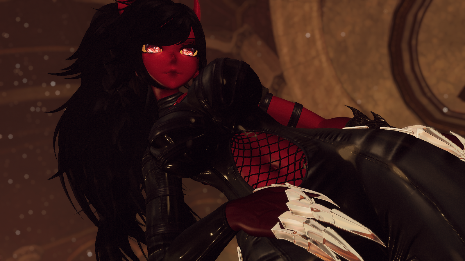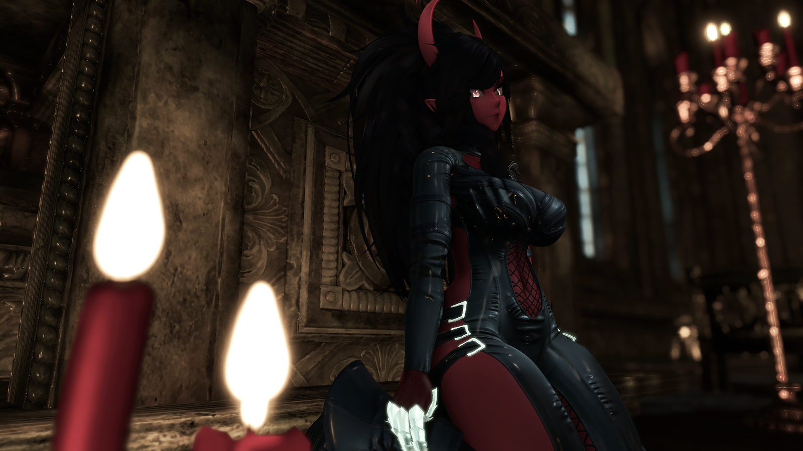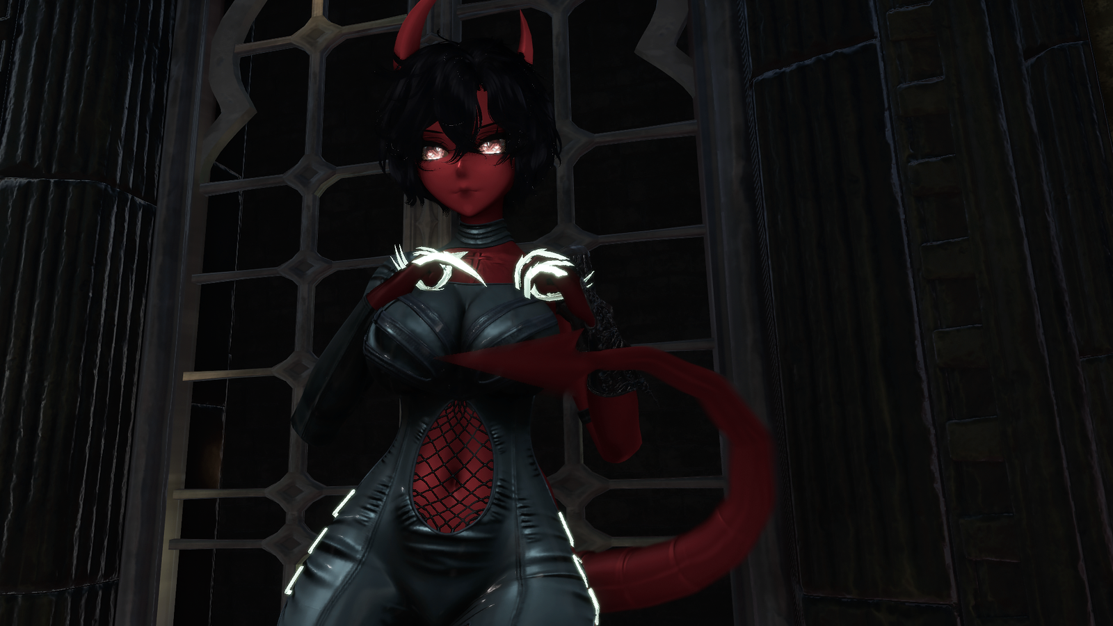 ponytail hair, throat texture, eye texture, demon textures, human face texture, horns, tail, jacket, tanktop, shorts, bodysuit, heels, boots, heeled boots, socks, skirt, bra, bikini, harness, jacket, choker & textures made by me, illumevr.