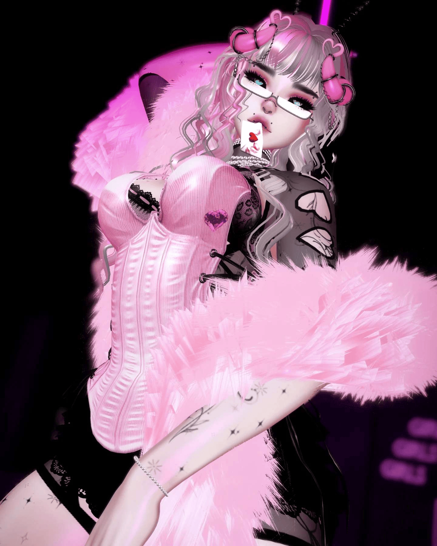 Accessories (19) Horns, Heart Springs, Sleepy Mask, Glasses, Love Letter, Earrings, Face Piercings, Pearl Choker, Pearl Necklace, Pearl Necklace 2, Pendant, Boa, Gloves, Ciggy, Bodysuit, Fluffy Handcuffs, Bracelets, Rings, Heart.