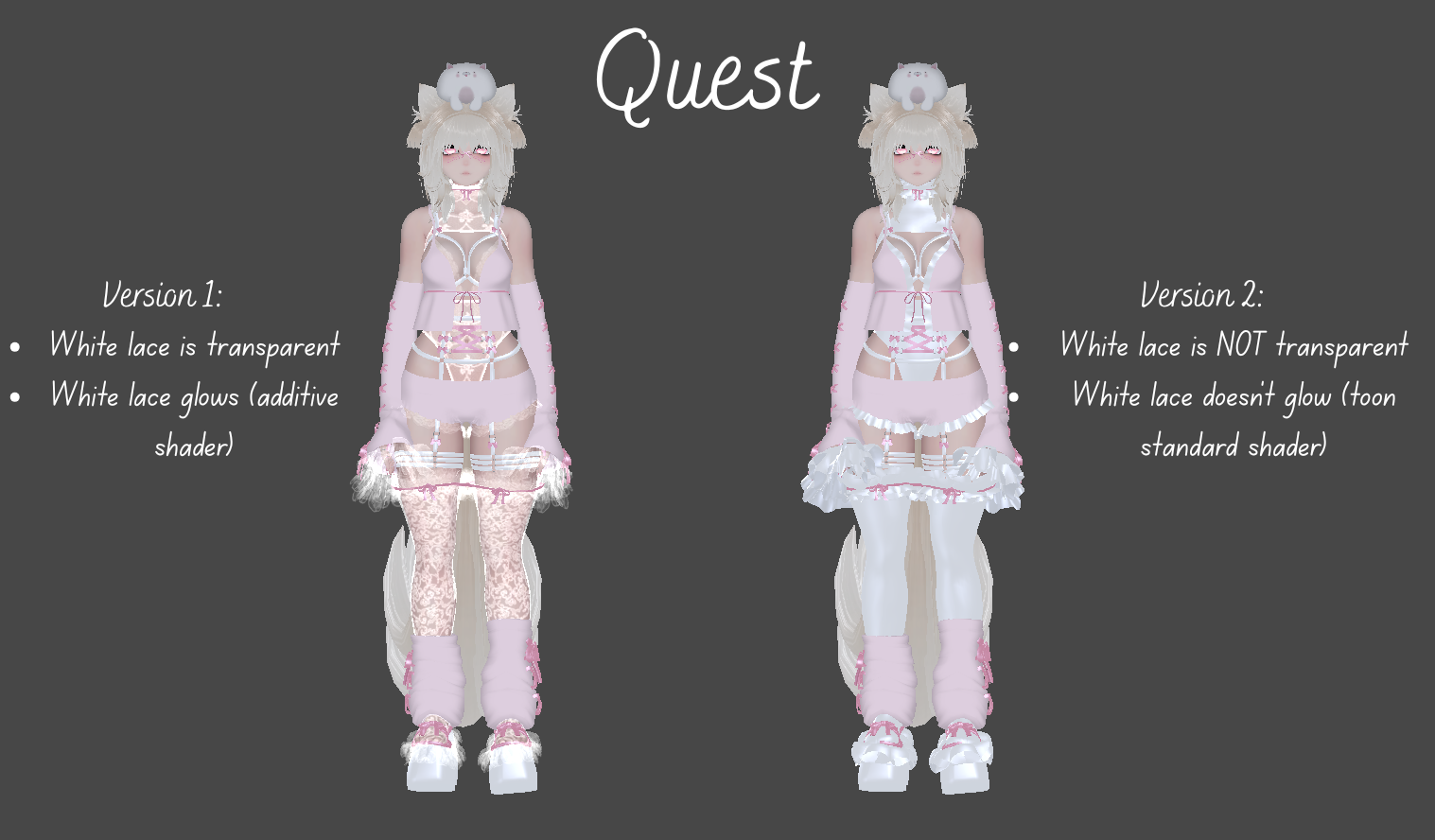 Hair re-rigged to be quest compatible, no lace on harnesses, 2 versions with different options for white lace (one is see-through, one is not), no avatar brightness slider, no outlines