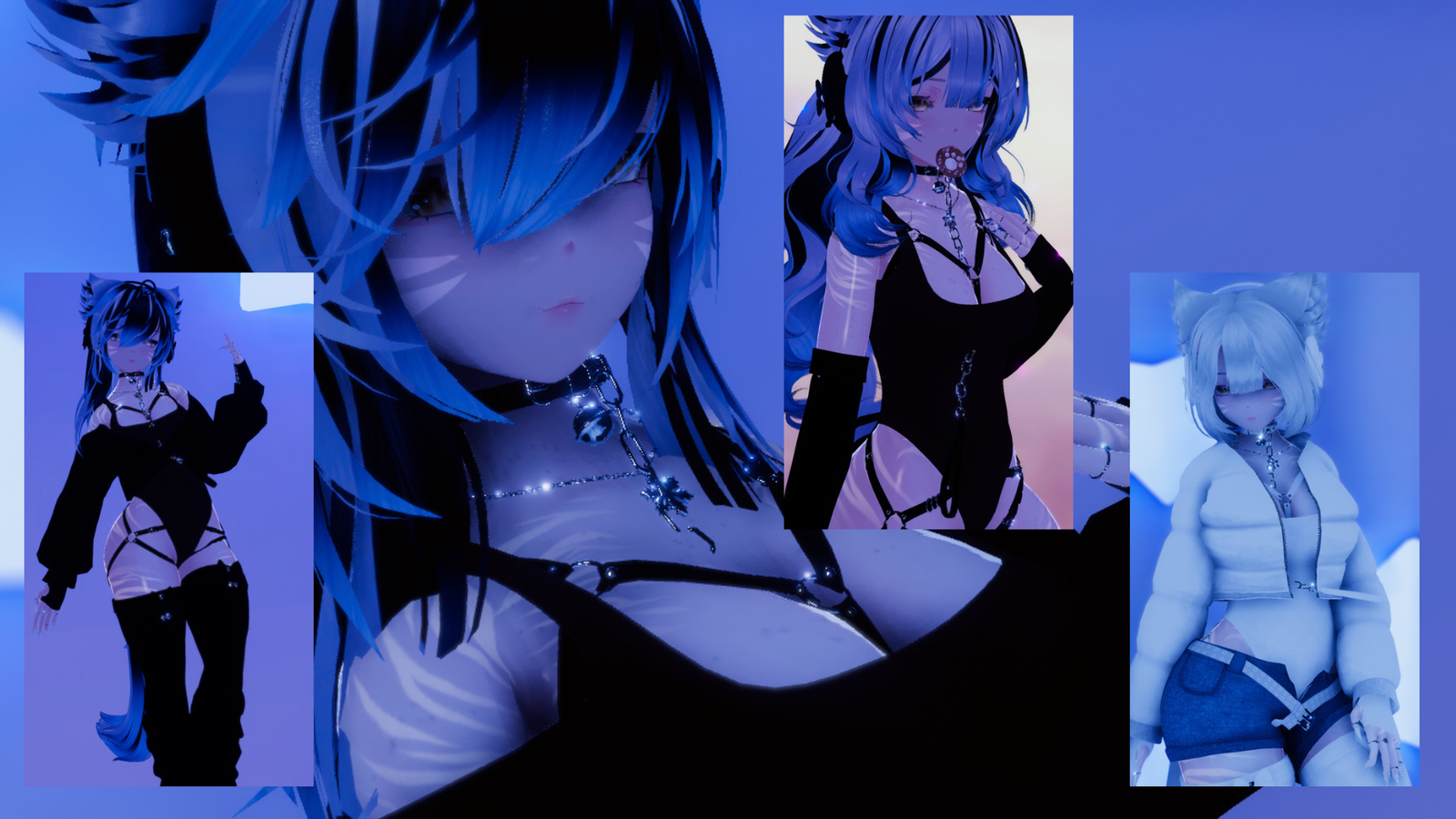 Acc: fans, cookie, collar, leash, pasties, harness, muffs, necklace,
