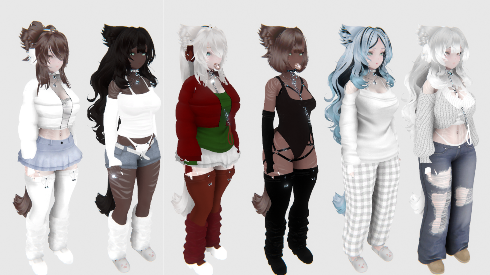 Clothing: long sleeve, cardigan set, bodysuit, dress/top/skirt, jeans, comfy pants, shorts, undies, puffer