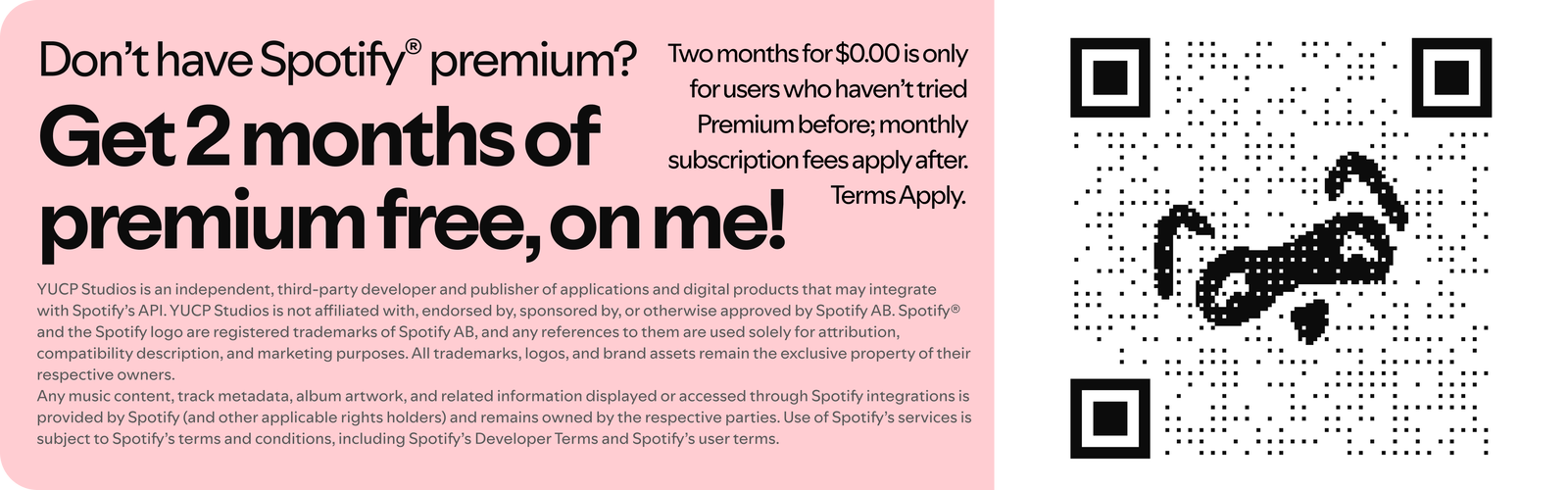 Song Thing is an independent tool by YUCP® Studio that integrates to the Spotify API to display your playlist metadata and provide links that open in Spotify®. YUCP® Studio, Song Thing, and this integration are not affiliated with, endorsed, certified, or sponsored by Spotify, and no partnership is implied. “Spotify” and the Spotify logo are trademarks of Spotify AB. Song Thing does not stream, download, or redistribute audio; playback and deeplinks occur in the official Spotify apps where supported. A Spotify account, premium subscription, and internet connection are required; functionality is subject to change if Spotify updates its platform or policies. Additional third-party terms may apply.